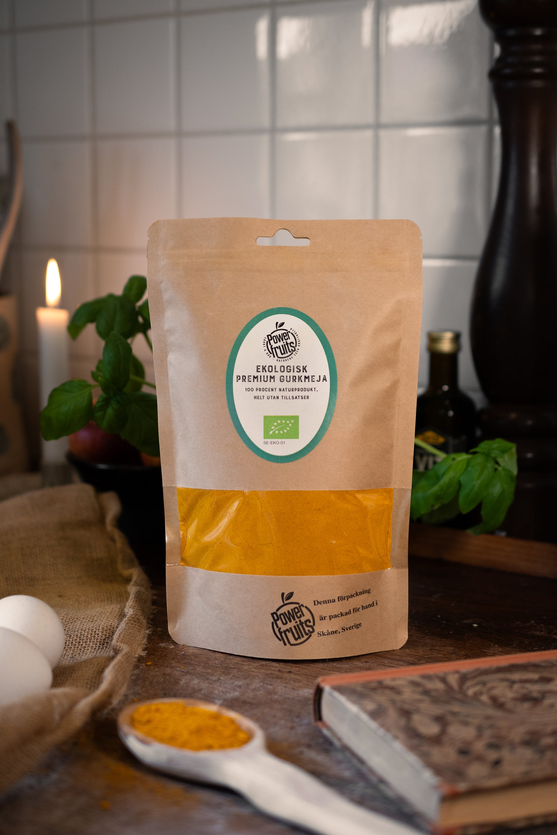 Powerfruits ekologiska gurkmeja är en kraftfull och färgstark krydda med djupa rötter i ayurvedisk tradition och modern hälsokost. Gurkmejan kommer från noggrant utvalda ekologiska odlingar och är varsamt torkad och malen för att bevara sitt höga innehåll av curcumin – det aktiva ämnet som gjort gurkmeja känt för sina antiinflammatoriska egenskaper.