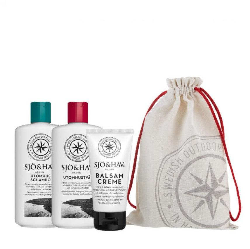 Saltvattentvål, saltvattenschampo och leave-in Balsam Creme i Sjö&Hav-påse av återvunnen bomull med röd dragsko. En trevlig och uppskattad gå-bort-present på sommarens fester och ett användbart kit som räcker hela säsongen. Förvara produkterna i påsen och behåll den sedan som praktisk förvaring av mobil, betalkort, nycklar, smycken mm under dagarna på stranden!